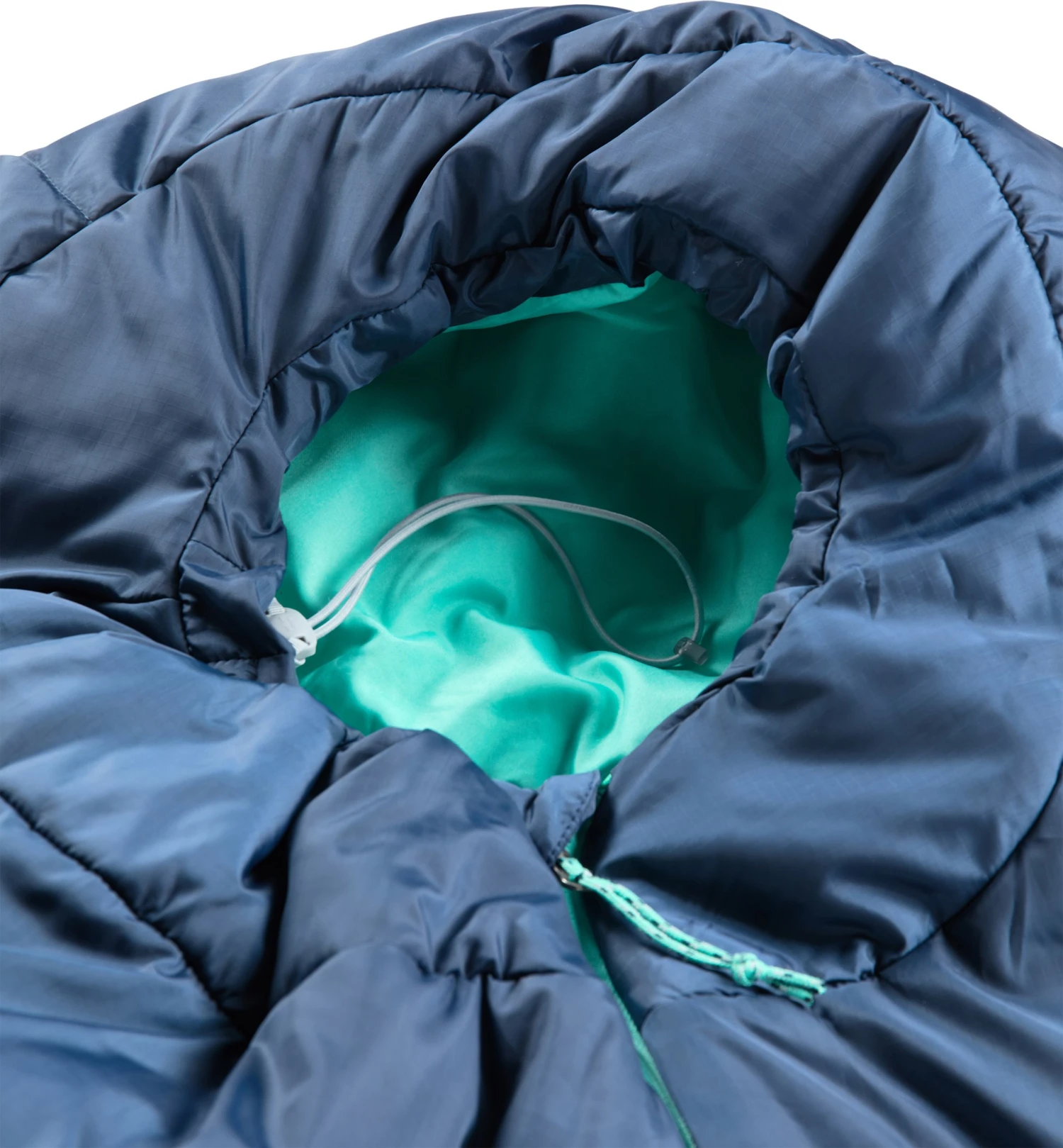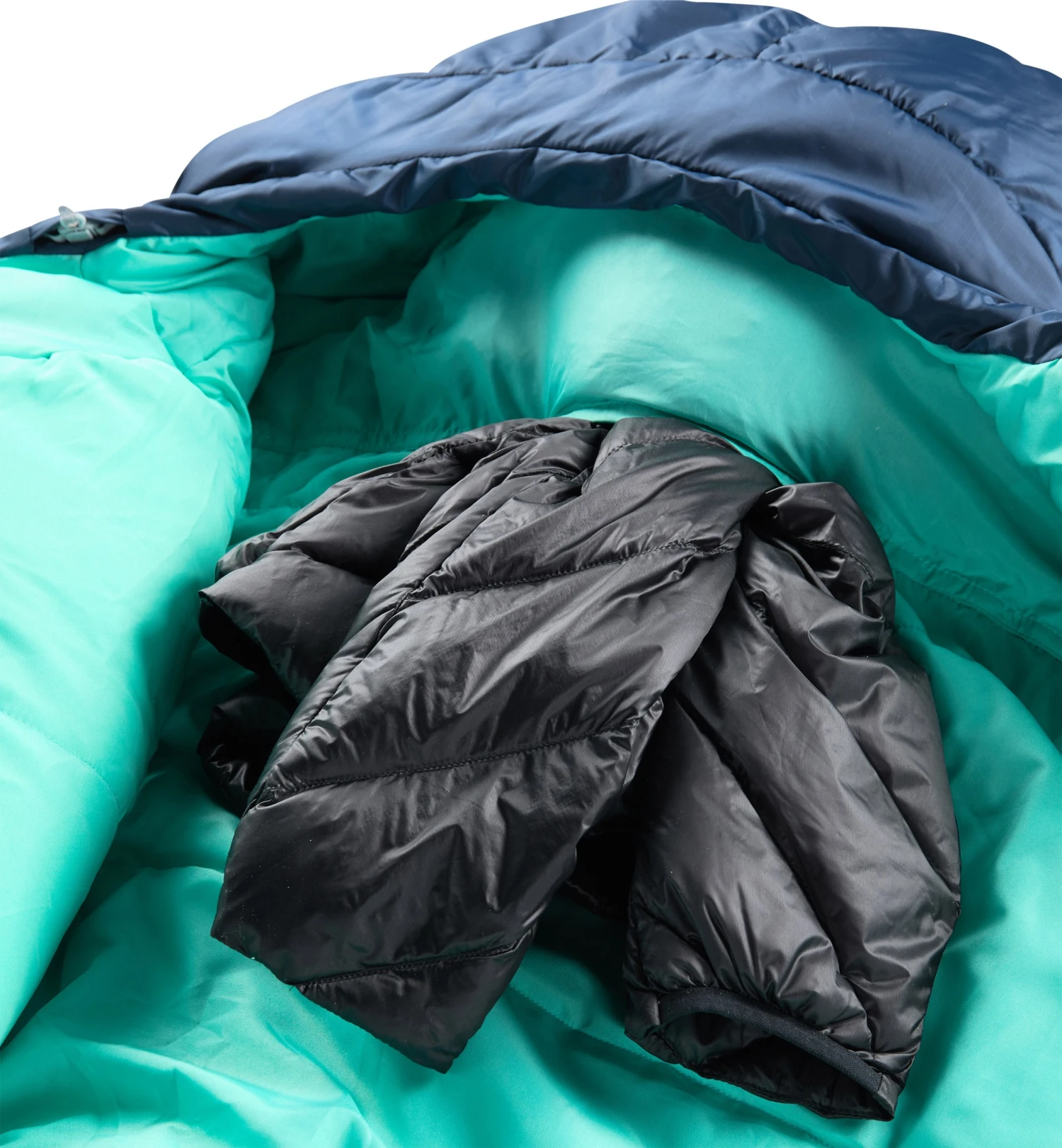 Den specielle termokonstruktion byder en særlig skæring på både soveposens over- og underside, så kuldegennemslag undgås, og den fiberfyldte stormflap bag lynlåsen hindrer effektivt kuldegennemtrængning, så den kolde luft effektivt holdes ude.