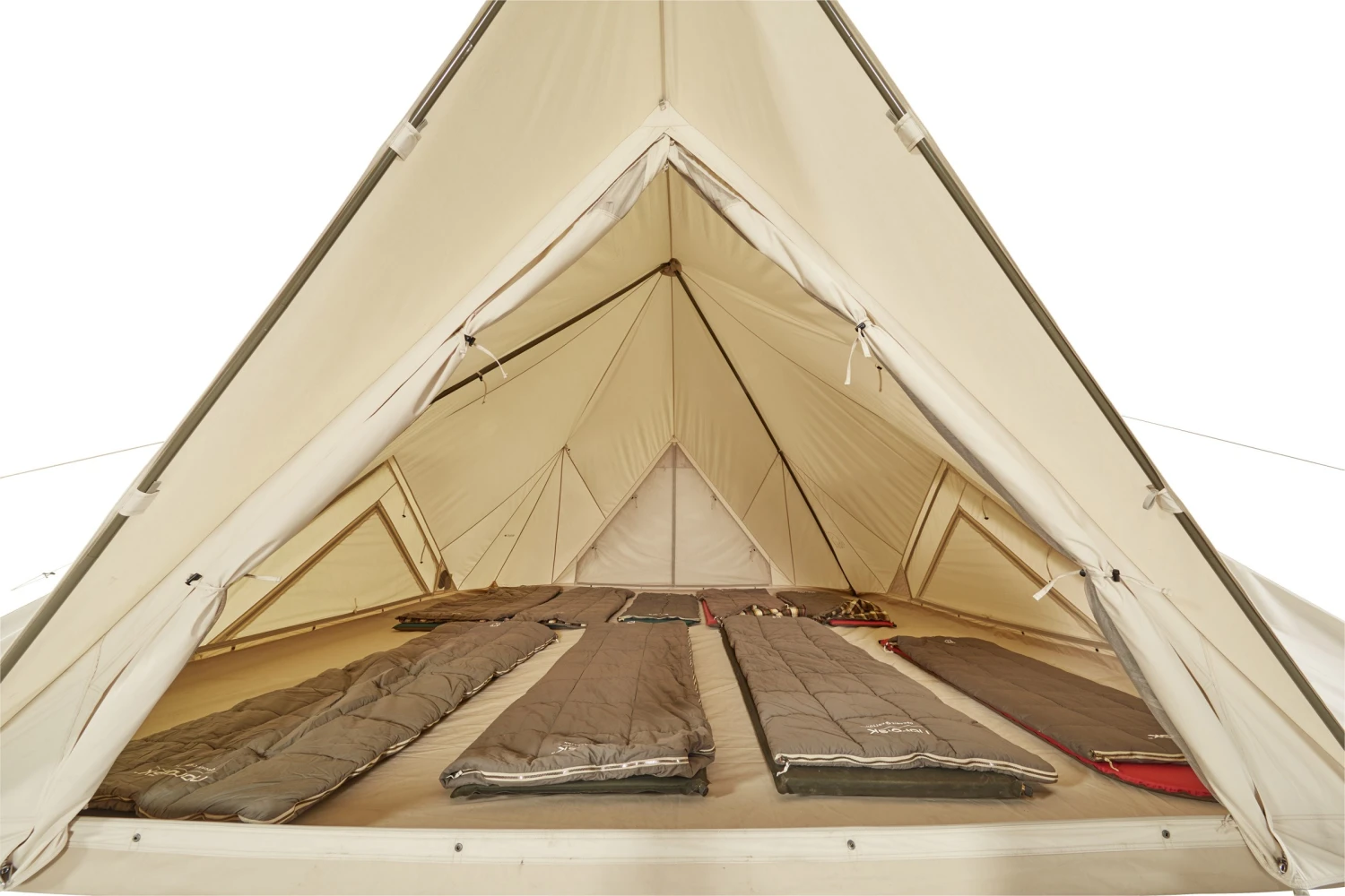 Og dette areal kan udvides ved at koble det sammen med ét eller flere af den mindre Vimur 4.8 Basic Cotton eller Vimur 5.6 Basic Cotton, så man eventuelt kan få opdelt sovekabiner og det store fællesareal. Og rumfornemmelsen er slående i dette telt, for dels har det en indvendig højde op til hele 3 meter, men de stejle vægge og det unikke design, hvor der ikke bruges én eller flere separate midterstænger, men i stedet en Turtle Hub™ -konstruktion med A-stænger ved blot de fire indgange, er i sandhed noget, der øger pladsfornemmelsen indeni teltet! Og så er det trods teltets størrelse samtidig utrolig nemt og hurtigt at slå op og kræver blot 16 pløkker for at stå klippefast.