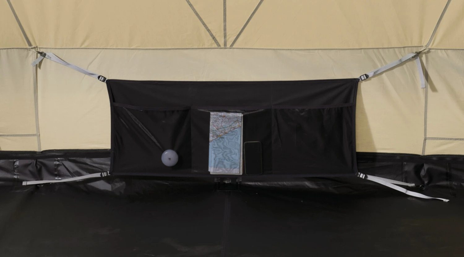 Lommerne har regulerbare remme i hvert hjørne, så de kan tilpasses den enkelte teltmodel.