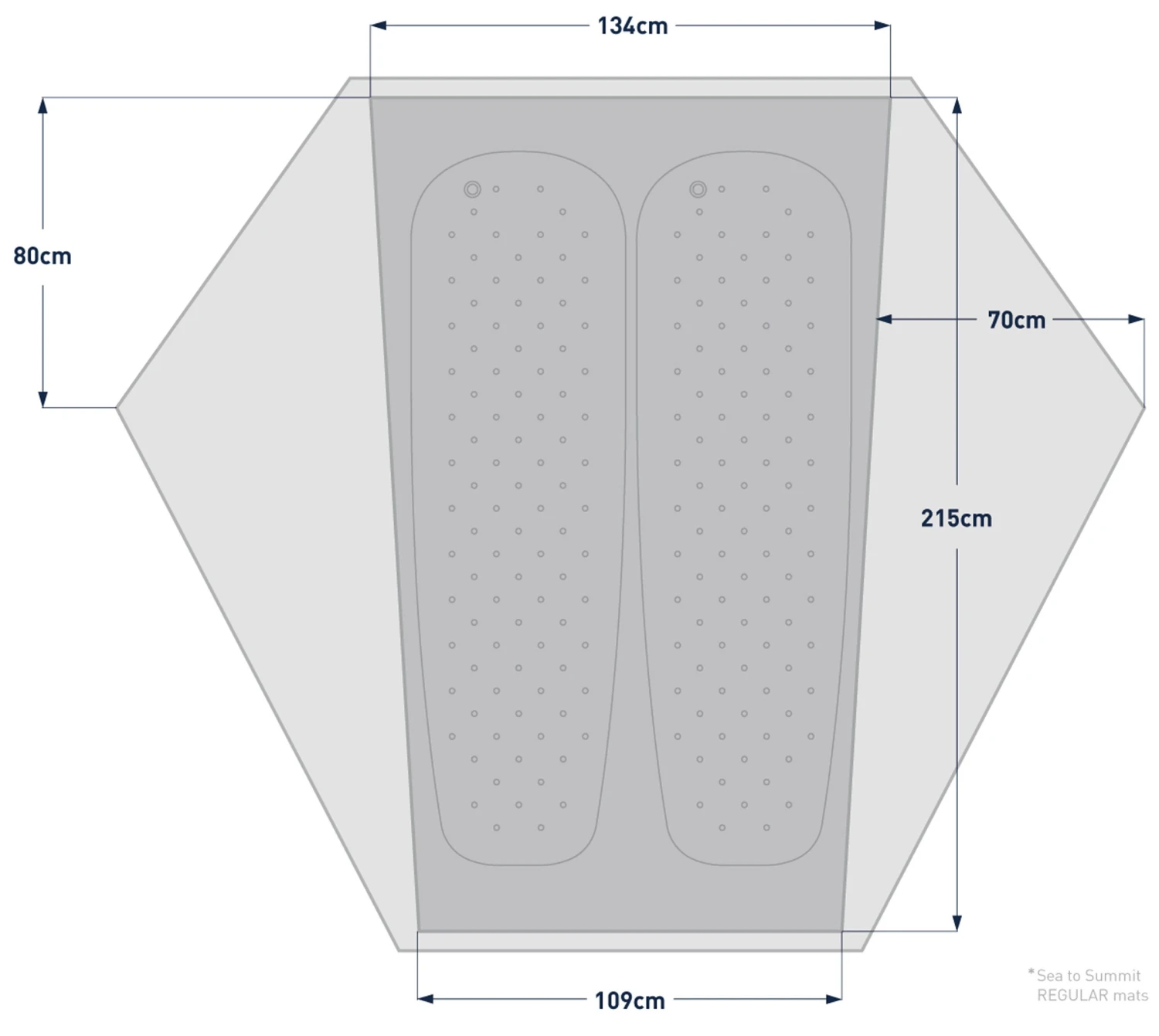 Således er dette Telos TR2 Ultralight Backpacking Tent med sin samlede pakkevægt på kun 1,65 kg. et fantastisk let og uhørt rummeligt topersoners telt, der med sin patenterede Tension Ridge Architecture® stangfiguration byder på en indvendig telthøjde på hele 105 cm, en indvendig bredde på mellem 109 og 135 cm og så en liggelængde på 215 cm. Arealudnyttelsen i bunden af inderteltet giver altså både plads til liggeunderlagene og noget ekstra grej og gear, som man nemt og hurtigt skal kunne komme til. Vi har simpelthen ikke kendskab til et lettere telt, når pladsen i teltet tages i betragtning!
